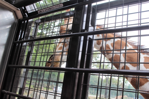 ドキドキの猛獣へのエサやりを終え、コースの後半は草食動物ゾーンなのでゆったりした気分で楽しむことができます。キリンゾーンではガイドさんが葉っぱの束を車外に突き出してくれるので、それを目当てにやってきたキリンの可愛いお顔を、アップで激写することができます。