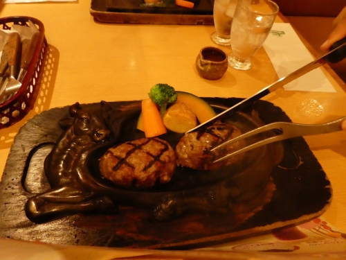 • 写真:トラベルライター炭焼きハンバーグ(左:オニオンソース、右:塩コショウ)