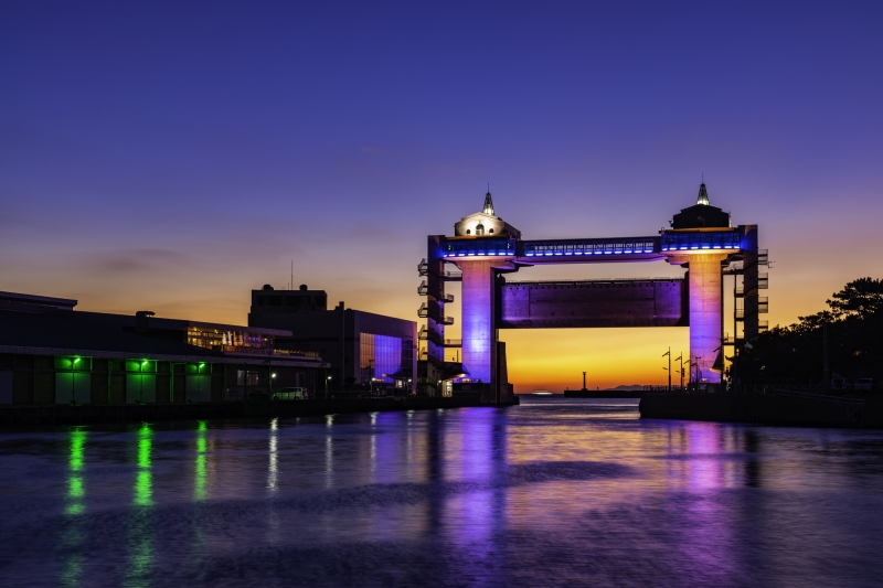 東海地震の津波を防ぐ目的で建設されました。津波をシャットアウトする扉体は、幅40m、高さ9.3mの大きさで、夜にはライトアップが行われています。展望室も20時までオープンしており、沼津港周辺をはじめとする夜景鑑賞が楽しめます。