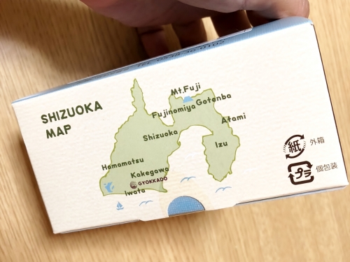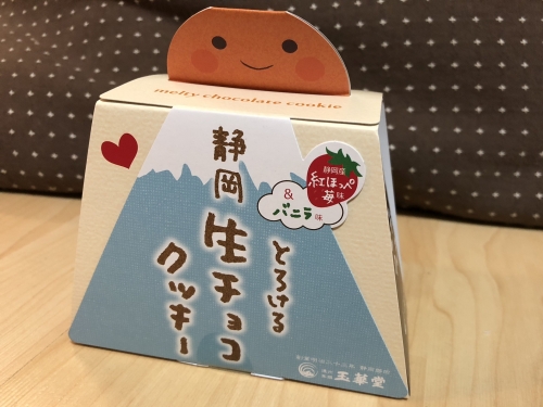 磐田市に本社のある玉華堂のお菓子「静岡とろける生チョコクッキー」。かわいい富士山の形をしたこのパッケージ、箱の底には静岡県のイラストマップも描かれています。こちらは6枚入り480円のパックで、他に、8枚入りや12枚入りもあります。