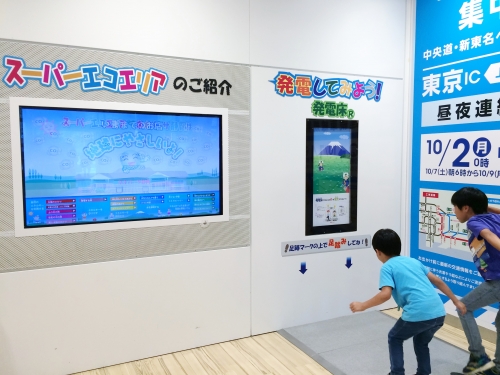 それは、無料で遊べるスペースがあること。外には滑り台など外で遊べる遊具と丘があり、長いドライブで体力が余っている子どもが思い切り遊べます。もう一つは建物内の「エコエリア」。静岡SAは環境へ配慮したエリアということで、遊んで発電体験できるスペースがあるのです。雨の時も建物の中で楽しめますよ。