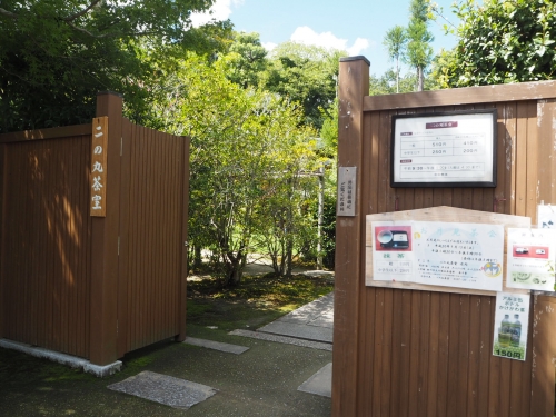木造平屋建て、一文字葺き(いちもんじぶき)の伝統的な数寄屋造り(すきやづくり)の建物が二の丸茶室です。