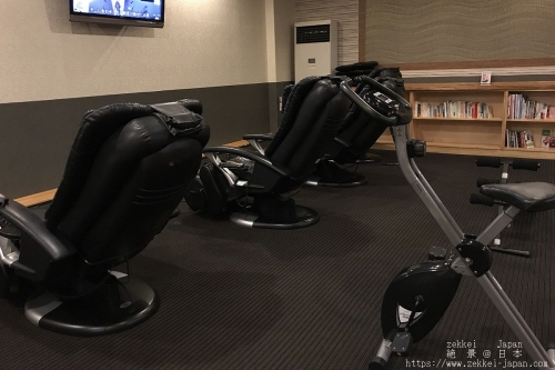 部屋にお風呂はありますが、館内2階には宿泊者専用の無料休憩所とお風呂「柚子の湯」があり、25時迄入れます。無料休憩所にはバランスボールやマッサージチェア、バイクがあり、軽く汗を流す事やくつろぐことができます。
