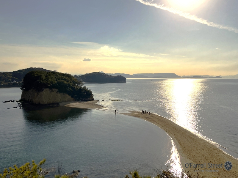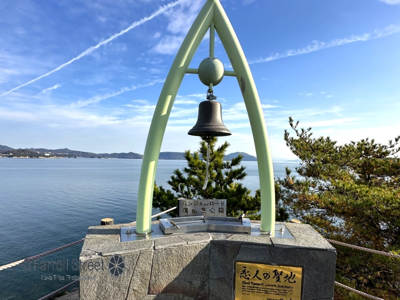 手前の弁天島の上には、恋人の聖地「約束の丘展望台」があり、5分ほど登れば頂上に到着、瀬戸内海の島々や、屋島などが眺められます。エンジェルロードを見下ろしつつ、幸せの鐘を鳴らすこともできます。