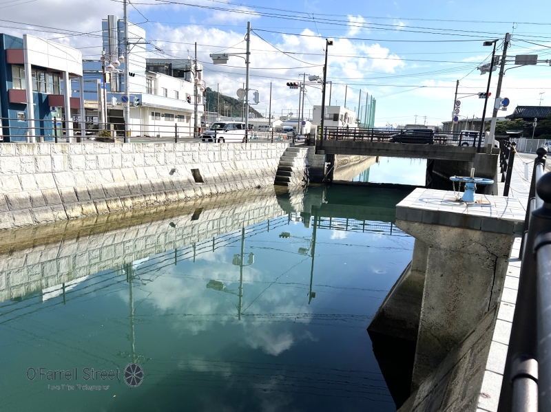 岡山港からカーフェリーで、土庄港へ。小豆島には車持ち込み、乗船客も少なめだったので入港後は目的地へすぐに出発できました。まずは車で5分の土淵海峡(どふちかいきょう)へ向かいます。1996年に「世界で一番狭い海峡」としてギネス記録に認定された土渕海峡の最も狭い場所はわずか9.93m、全長は2.5㎞です。