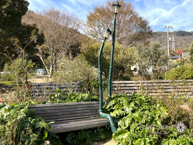 120種類ものハーブとバラが咲きそろうハーブガーデンに置かれたベンチには、まるで恋人同士のように寄り添う外灯が。夕暮れ時になってライトアップされると、いっそうロマンチックな雰囲気になりそうです。