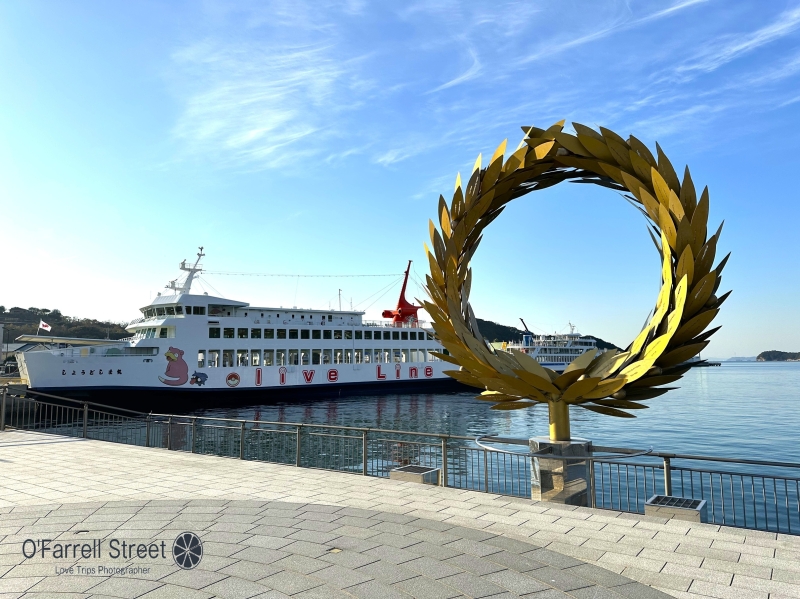 瀬戸内国際芸術祭の作品の一つでもあるオリーブの金冠「太陽の贈り物」。 小豆島の玄関口ともいえる土庄港の埠頭で光り輝いています。この他にも付近には、アート作品が点在しているので、出航前のひととき、散策が楽しめますね。