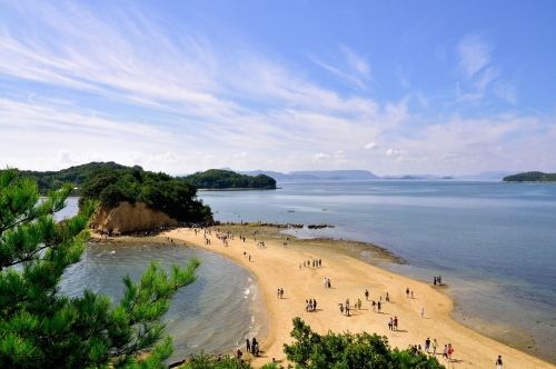 小豆島に浮かぶ、潮が引くと現れるロマンチックな道。ここを手を繋いで歩いたカップルには天使が舞い降り、幸せになれるというパワースポットです。