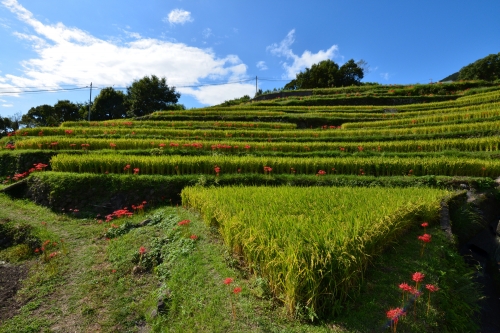小豆島の真ん中、中山地区の標高約200mの山腹に、大小さまざまな大きさの約800枚の水田が連なります。毎年、半夏生のころには松明(たいまつ)を手に棚田の畦道を歩く「虫送り」が行われ、幻想的な夏の風物詩となっています。この「虫送り」は映画『八日目の蝉』のワンシーンにも出てきます。そして9月下旬ごろからは真っ赤な彼岸花が棚田を赤く染め上げます。黄金色に輝く稲穂が見事な初秋に訪れるのもおすすめ。