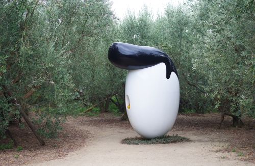 瀬戸内国際芸術祭の一環で設置されたアートの一つで、オリーブ畑の中に突如現れる立体作品です。オリーブの実をイメージしたユニークなデザインで、顔の部分にあるくぼみには、来た人がものを置いていくコミュニケーションツールにもなっています。運が良ければリーゼントのかぶり物が置いてあることも。