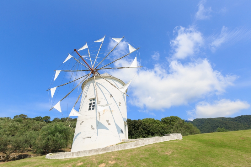 小豆島のシンボルとして知られているギリシャ風車までは、小豆島オリーブ園から歩いて約5分です。小豆島とギリシャのミロス島の姉妹島提携を記念して建てられた風車の下は写真の撮影スポットとなっており、家族連れからカップルまで、幅広い年齢層の方々が記念の写真を撮っています。