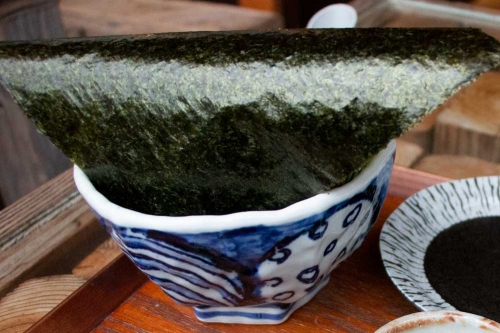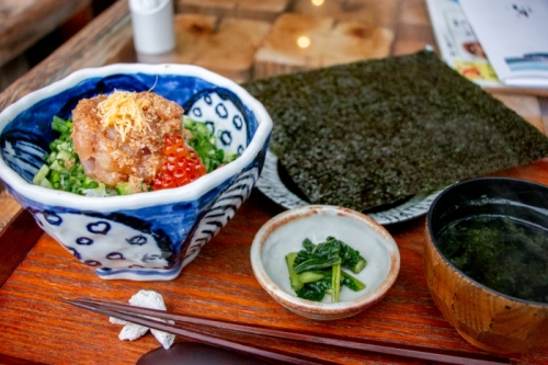 看板メニューの「まかない丼」は、旬の魚を使ったなめろうが秘伝のごまダレで仕上げられ、大きな海苔に覆われて出てきます。そのままいただいたり、巻き寿司のように海苔に包んだり、セットのお汁をかけたりなど、様々な食べ方が楽しめるよう工夫されています。