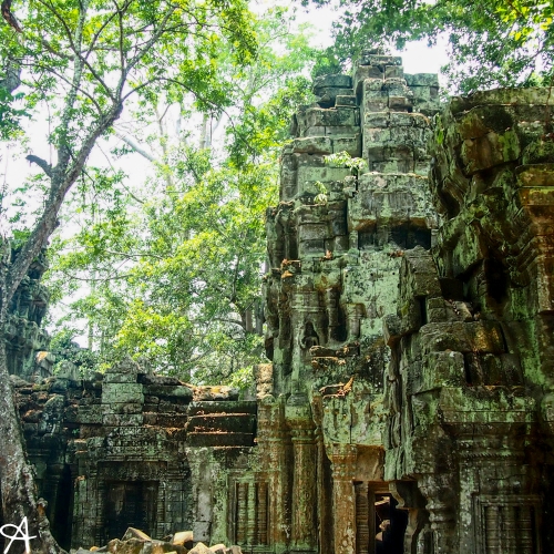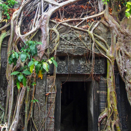 『トゥームレイダー』のロケ地として有名なタ・プローム。発見された当時からすでに遺跡は樹木に覆われていたようで、今も発見当時の状態で保存されているとのこと。木と遺跡を一緒に写すことで、遺跡と自然の共存が神秘的な写真になります。