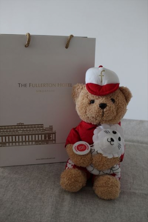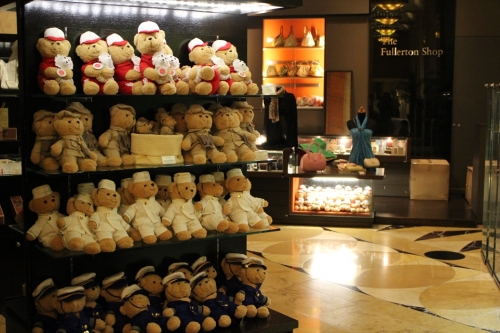 フラトンホテルの正門を入ると、フラトンホテルのキャラクターであるフラトンベアのSG50バージョンがお出迎えしてくれます。マーライオンを抱きかかえたベアーは、奥の「フラトンショップ」にて$22で販売しています。