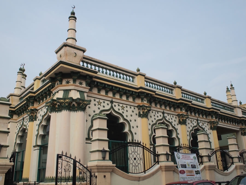 クリーム色と緑色、そして星と月。外観に特徴のあるアブドゥル・ガフール・モスクはムーア式と南インド式を融合したもので、1910年に建造されました。