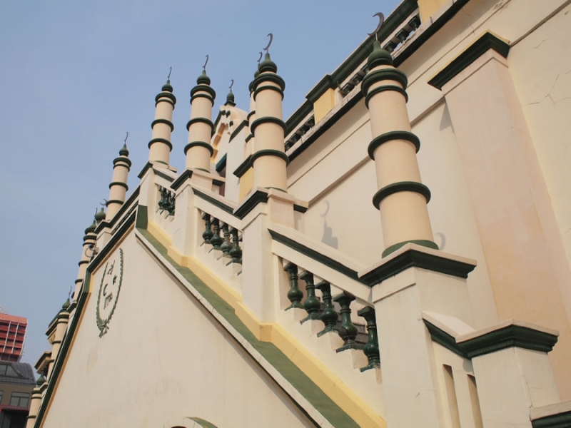 ジャマエ・モスクはシンガポールで最も古いモスクのひとつで、南インドから移民したイスラム教徒によって1826年に建てられました。ミントグリーンの爽やかな色をした外観が特徴的で、南インド様式をはじめ様々なスタイルの様式が用いられています。また、シンガポールの国の重要記念建築物に指定されています。