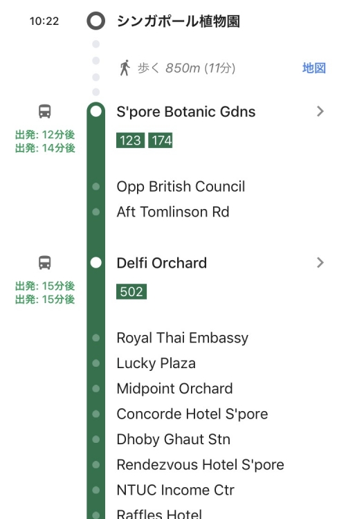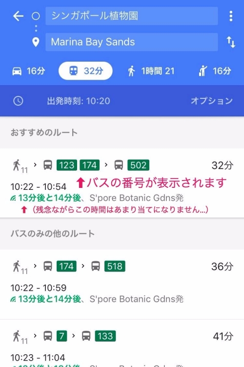 シンガポールでGoogle Mapを起動し、行きたい場所を検索すると、バスでのルートを表示してくれます。