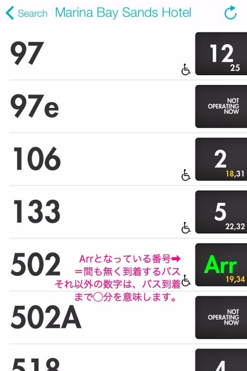 無料アプリですが、広告も最低限に抑えられており調べ方も簡単です。Google Mapでバスの番号を調べてから、SG Busesで到着時間を調べるという使い方もオススメです。