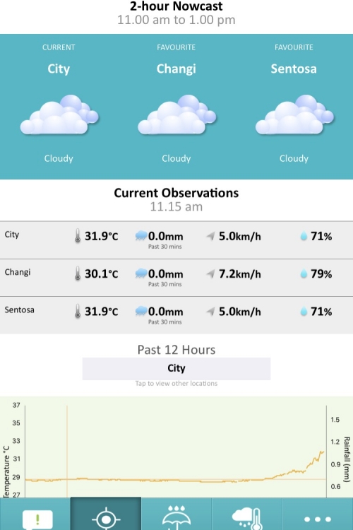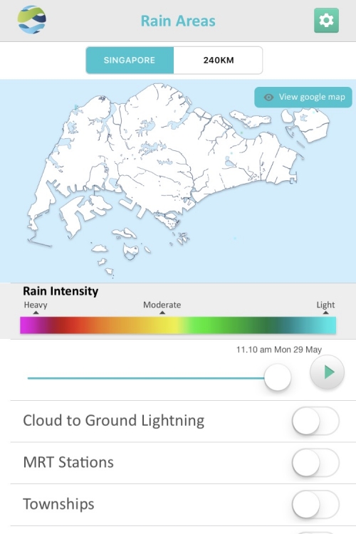このアプリでは、天気予報の他、シンガポールの各地でどのくらい雨が降っているかを確認できたり、雨雲の位置や動きを確認することができます。