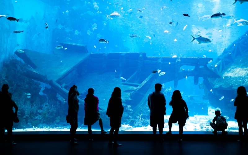 世界最大級の水族館。サメやマンタをはじめ、5万匹の海洋生物が泳ぐ36メートルの大パノラマ水槽が最大の見どころです。館内には魚を見ながら食事できるオーシャンレストランもあり。