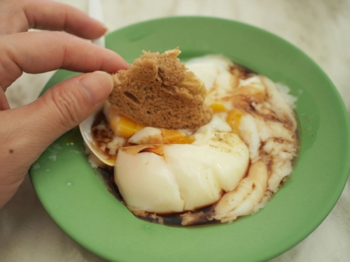 セットで注文すると温泉卵が付いてきます。温泉卵にしょうゆをたらし混ぜて、そこにカヤトーストをつけて食べるのがローカル流!