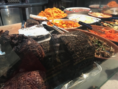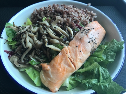 左下の写真は、ミックスサラダ(SGD2/約170円)、ブラウンライス(SGD2/約170円)、サーモン(SGD5.5/約460円)きのこ(SGD2/約170円)にビネガードレッシング(無料)をチョイス。