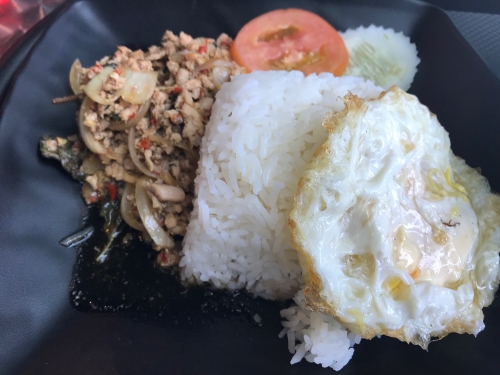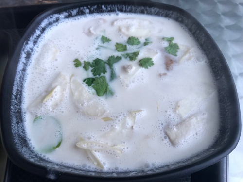 タイの定番ランチ「ガパオ(SGD10.9/約980円)」をまぜまぜしながら食べるのもおいしいですが、ここで是非試してもらいたいのが「カムガーカイ(SGD9/約750円)スープ」。ココナッツミルクがたっぷりの、酸味があるけどクリーミーなお味がくせになってしまいます。
