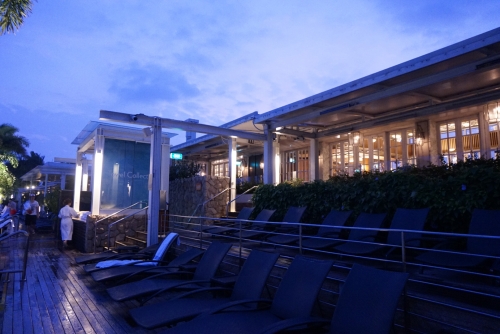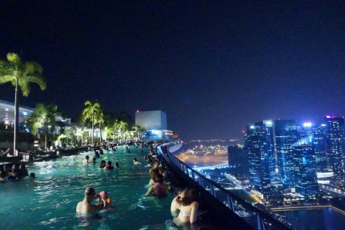 ここは宿泊者のみ利用できるインフィニティプールです。以前放送されていたCMのロケ地でお馴染みの方も多いと思いますが、この屋上インフィニティプールから見渡す世界都市・シンガポールの景色は絶景です。空に溶け込むようなインフィニティプールは一度は入ってみたいプールです。