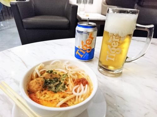 写真:トラベルライターシェアNO.1のシンガポールブランド「タイガービール」のお供は茹で立ての米粉麺料理「ラクサ」。