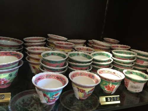 街中でもお土産店などで購入できますが、街中のショップよりも少し安くて、品揃えが豊富なのが、「ソウワン・ポッタリー・ジャングル」。元々は窯元だっただけあって、プラナカン陶器をさがすなら、ココを訪れれば間違いなしです。お皿は30ドル前後、カムチェンと呼ばれる蓋付きの小物入れは20ドル~。レンゲや箸置きなどの小さな物は3~10くらいなのでお土産にいいですね。