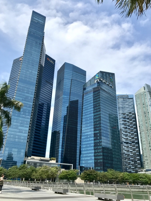 マリーナベイ・サンズの方から、外を歩いて行くこともできます。五つのビルの真ん中、上部に緑と青を組み合わせたマークが入っているビルです。