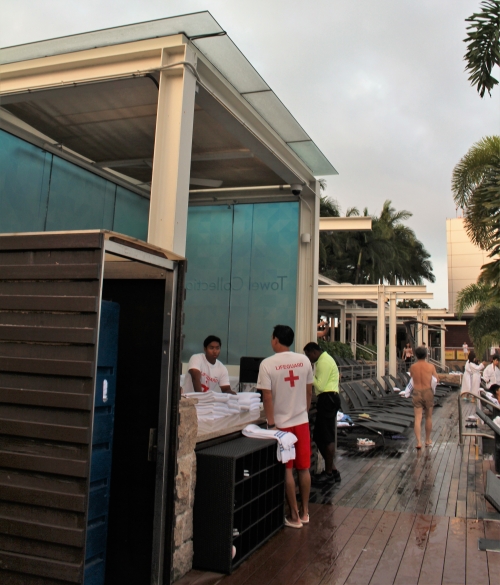 シャワーはプールサイドにいくつもあり、自由に使えます。いつでも清潔なタオルが用意されている「タオルバー」も完備され、スタッフに枚数を伝えれば何回でも利用することができます。部屋からタオルを持っていく必要がないのは便利ですね。