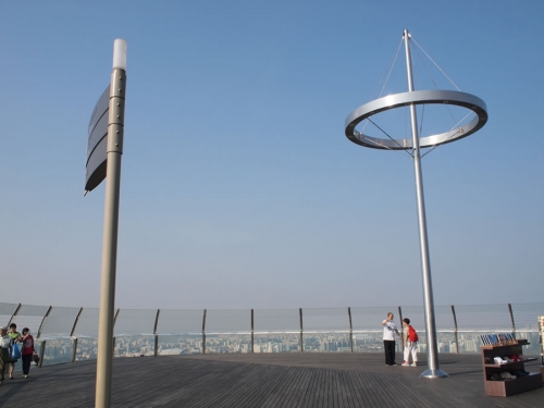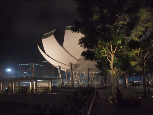 マリーナベイサンズ・スカイパークは、3つのホテルタワーの上に乗っかる船の形をした空中庭園。地上200mの高さからは、シンガポールの絶景をほぼ360度楽しむことができます。そして、マリーナベイに咲く白い花!蓮の花をイメージした建物は「アート・サイエンス・ミュージアム」です。