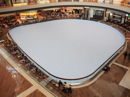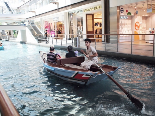 手漕ぎの小舟でモール内の運河を巡るサンパンライドや、決まった時間に約15分行われる水のパフォーマンス、レイン・オキュルス。そしてB2Fのフードコート隣には、およそ600㎡のスケートリンクと、ショッピングやグルメ以外の楽しみもまるよ。