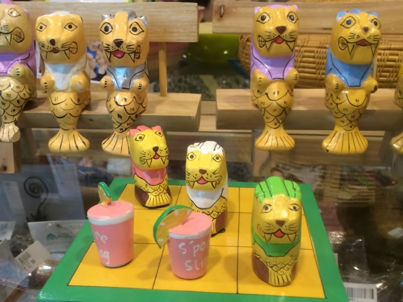 人気の木彫りのマーライオン。手前はチェス駒。