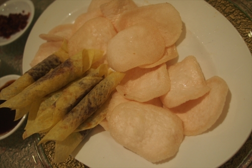 ラッフルズホテルの目の前にあるので、観光ついでに訪れることもできる「アジア・グランド・レストラン」。煌びやかなシャンデリアが印象的な中華料理レストランで、店内には生け簀もあります。こちらでぜひ食べたいのが北京ダックですが、なんと、一羽38ドルと格安!驚きのお値段ですよね。一羽だと、4人でちょうどいい量だと思います。照り照りの皮を素早くスライスし、シュンピンと呼ばれるクレープ生地に巻いてサーブしてくれます。