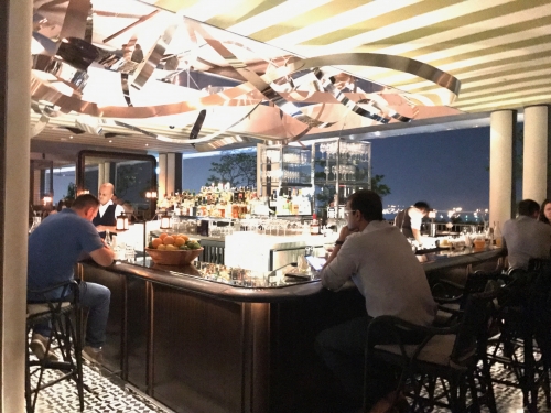店内奥には食事のできるテーブル席もありますが、おすすめは店内手前の天空のバー。高級感あふれる内装に一瞬どきり、としますが、外を眺めてみて思わずうっとり。
