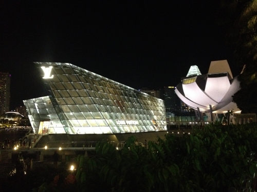 勢いのあるシンガポールを象徴するかのようにマリーナベイに浮かぶ、かっこいいルイ・ヴィトン!手がけたのは、マリーナ・ベイ・サンズ・ホテルとおなじく、建築家のモシェ・サフディ氏。地上3階、地下2階からなり、ルイ・ヴィトンのフルラインアイテムが並ぶほか、ブックストアも。ギャラリーのように洗練された店内のインテリアは、ニューヨークに拠点をおく有名デザイナー、ピーター・マリノ氏が手掛けたとあって、ルイ・ヴィトンのテーマである「旅」が最大限に生かされた開放感たっぷりな空間です。