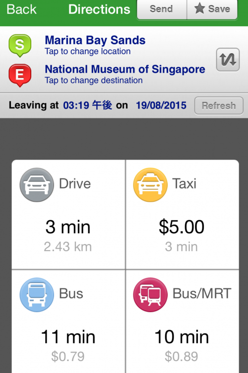 地図を見られるだけでなく、Directionsをタップして出発地点と目的地を入れれば、目的地への行き方を、Drive、Taxi、Bus、Bus/MRTの4つの手段で紹介してくれます。