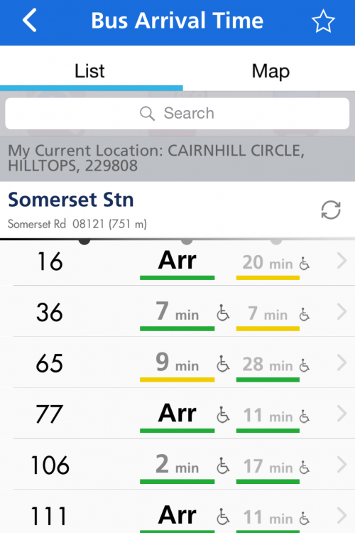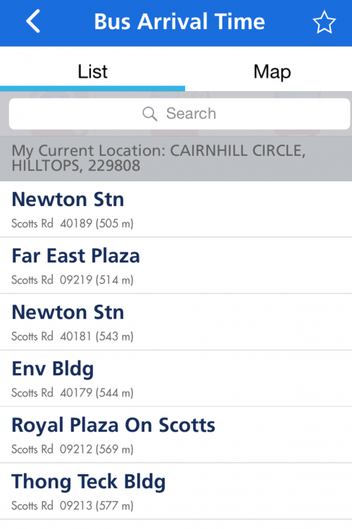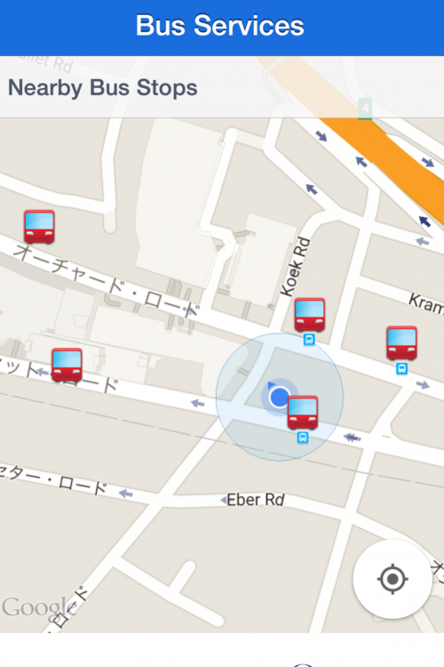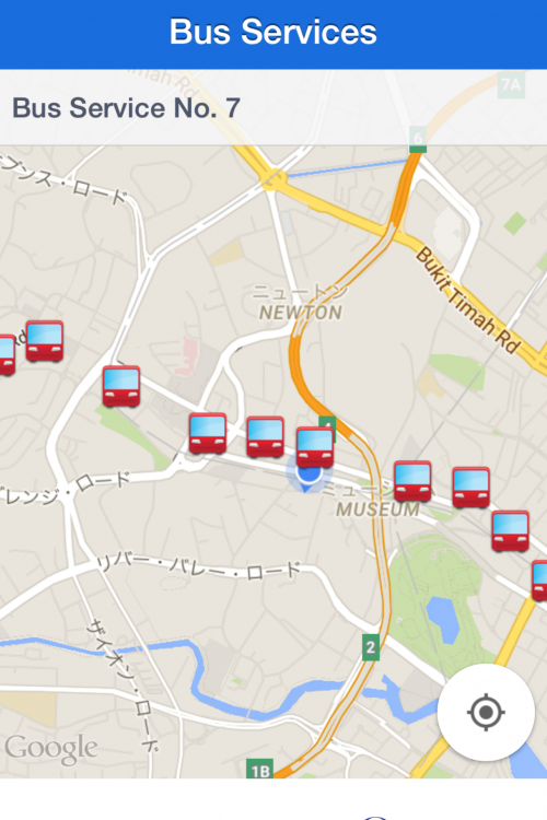 メニュー画面からBus Arrival Timeを開くと、自分がいる場所から近いバス停のリストと、その地図を見ることができます。