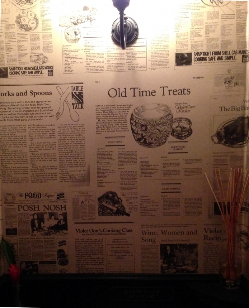 ブキティマ店のお手洗いの壁紙は、彼女が主宰した雑誌の記事のコラージュになっています。