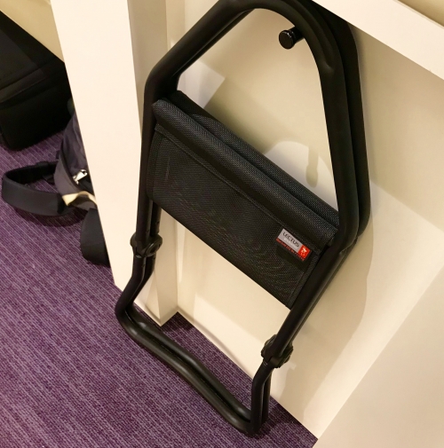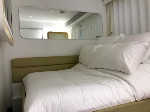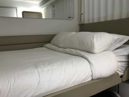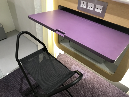 ベッドの頭部分にかけてあるのは、折りたたみの椅子です。棚の下に収納されている机を引き出すことでデスクワークもできますが、これを使うと、部屋のスペースのほどんどが埋まってしまいます。ひとり旅なら大丈夫ですが、同行者が一緒だとちょっとキツイかもしれません。