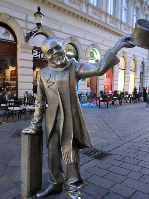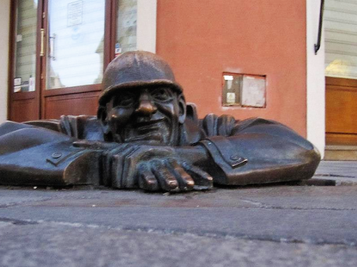 Panska(パンスカー)通りとRybarska brana(リバースカ・ブラーナ)通りの交差点で、マンホールおじさん発見!マンホールから顔を出しているおじさんはチュミル像と呼ばれているそうです。Rybarska brana通りを通ってフラヴネー広場に行く途中には、帽子を持ったおじさんの像(Schone Naci Statue)が立っていますので、一緒にユニークな写真を撮ってみてはいかがでしょうか。