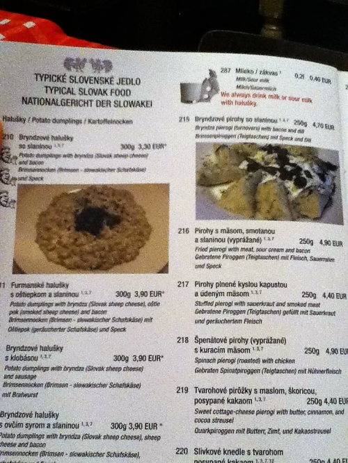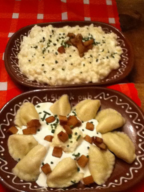 写真中央の上のお皿は、ポテトとヤギのチーズを使った料理「Bryndzove halusky so slaninou」(5.50ユーロ・約730円)です。同じ写真下の料理は「Domace bryndzove pirohy so slaninou a koprom」(5.90ユーロ・約780円)というお料理です。