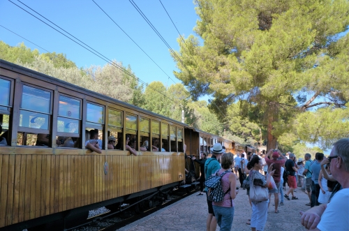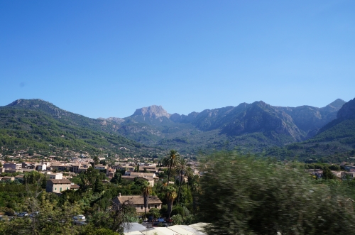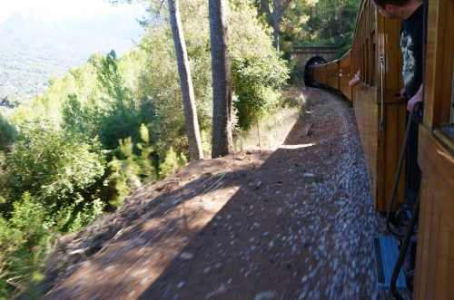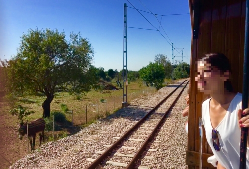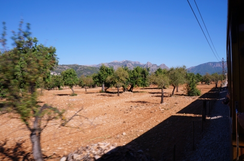 パルマ駅を出発した列車は、しばらく街中を路面電車のように運行し、オリーブ畑などの田畑を経て、徐々に世界遺産のトラムンタナ山脈を目指します。走行中の独特の車両の音は旅情をそそり、次々に移り変わる変化に富んだ車窓からの景色は、飽きることがありません。
