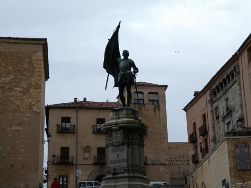 中世の反乱の証が今もなお残るサン・マルティン広場(Plaza de San Martín)。1520年、ヨーロッパ最大の勢力となった神聖ローマ皇帝カール5世(兼スペイン王カルロス1世)に対して「コムネロスの乱」を起こした結果、ここセゴビアで処刑されたファン・ブラボ(Juan Bravo)の像が中央にたたずんでいます。広場の前の通りはファン・ブラボ通りと名付けられ、無謀ともいえるこの反逆者への敬意のようなものを感じます。