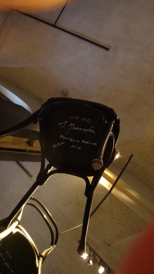 他にもカフェの右奥のエリアには、1989年にノーベル平和賞を受賞したダライ・ラマ14世のサイン入り椅子が天井から吊るしてあったり、入り口付近には、2012年にノーベル生理学・医学賞を受賞した山中伸弥教授のサイン入り椅子が吊るしてあったりします。