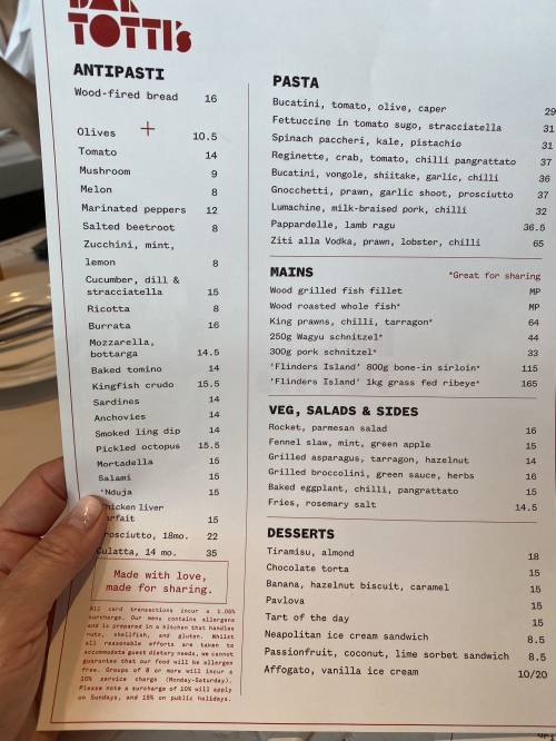 シチリア料理とワインが頂けるトッティズは、毎日、地元民や観光客が行列を作る人気店で、ほぼ予約なしでは、入店不可能なんです。店内とジョージ・ストリートを見渡せるテラス席があり、予約時にリクエストしましょう。