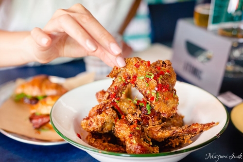 写真:Mayumi Iwasakiスイートチリソースの味付けとカリカリ食感が美味しいAtomic Wings($16.00/ ¥1,300)