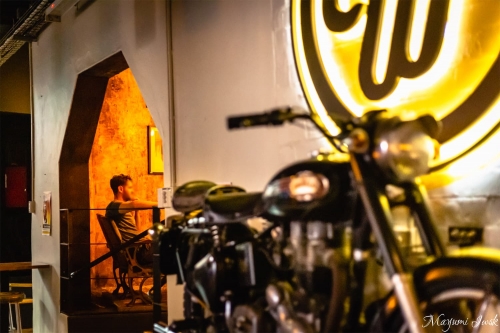 元ワイン工場だった広い空間にバイクやビールタンクで作った照明が置かれ、ガレージのようなインダストリアルな雰囲気が漂います。可愛らしいパッケージからは想像できないような、秘密の隠れ家のようなイメージです。